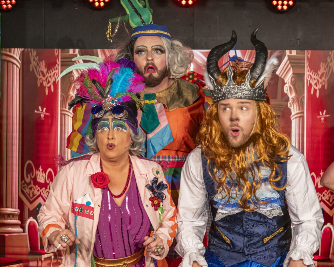 The jewel in this panto’s crown is most definitely diminutive Ada Campe, a multi award-winning variety artiste, cabaret performer, comedian and magician who has a twinkly, mischevious world-weary demeanour and eyepopping delivery that she adds to every double entendre as Belle’s father, The Inventorer. She has great fun turning back time initially just a couple of lines of dialogue, leading to questions and inappropriate answers in the style made famous by Barry Cryer writing for The Two Ronnies. Priceless!